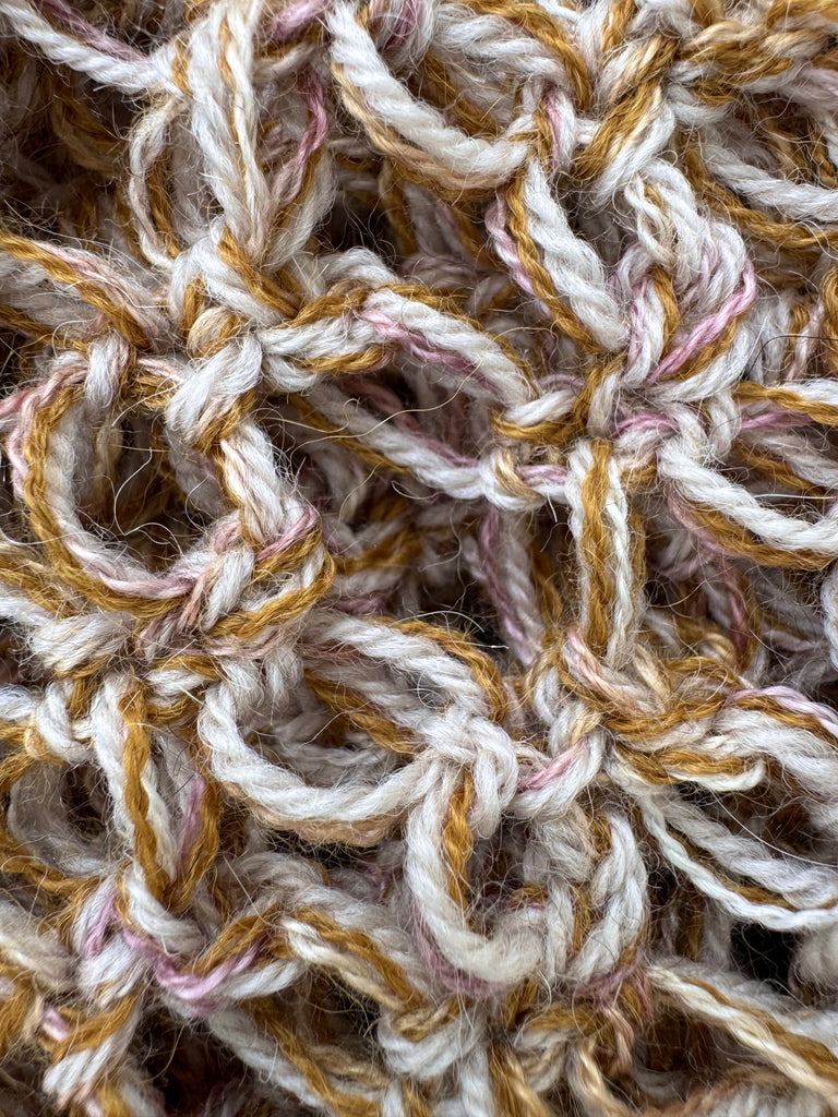 Farge: rust, beige og melert rust/grått/honning som følgetråd