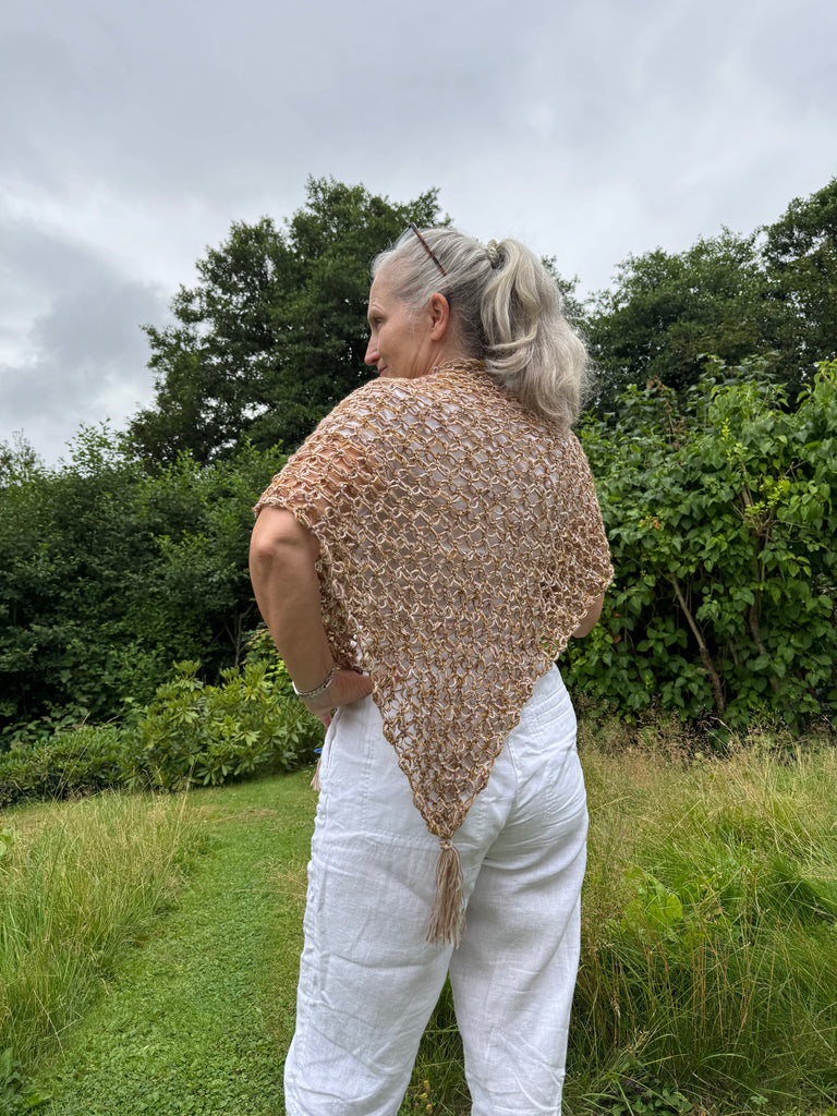 Sjalet er heklet med såkalte kjærlighetsknuter - den perfekte følelsen å svøpe seg inn i i stillhet. I hvert hjørne er det en lang, slank dusk.
