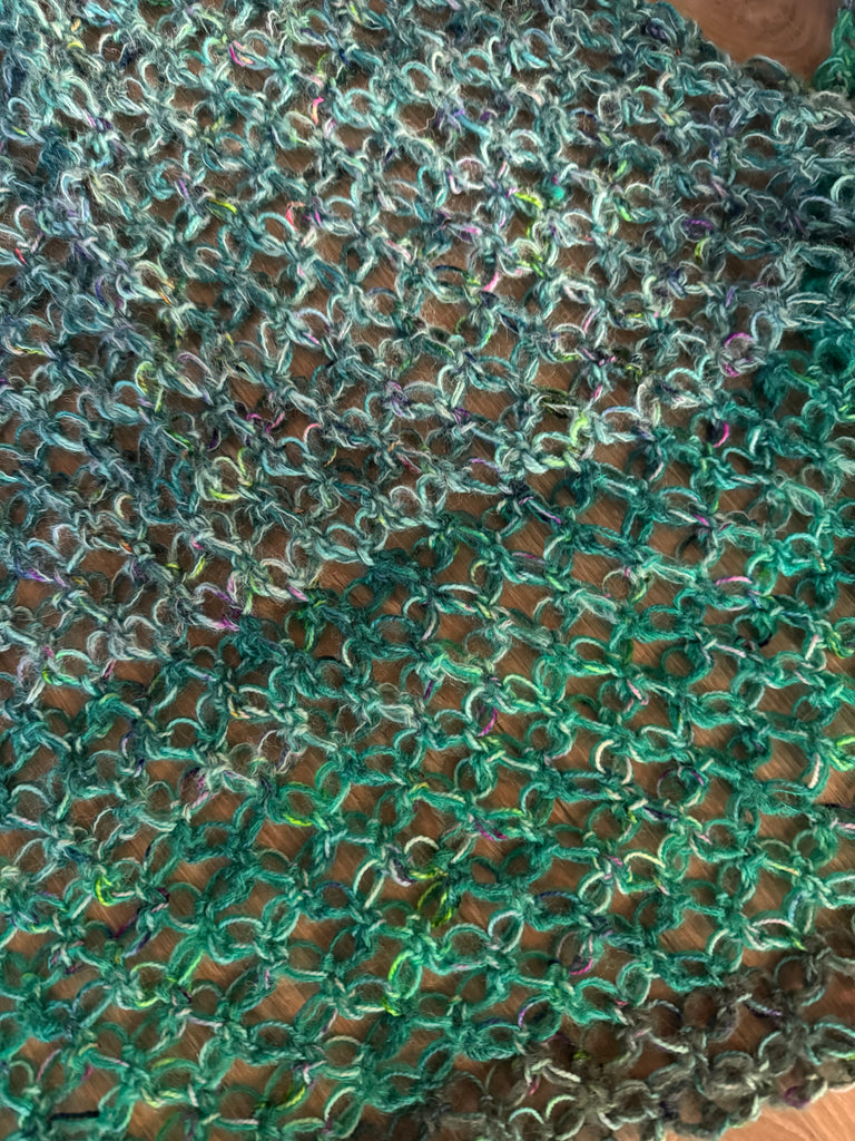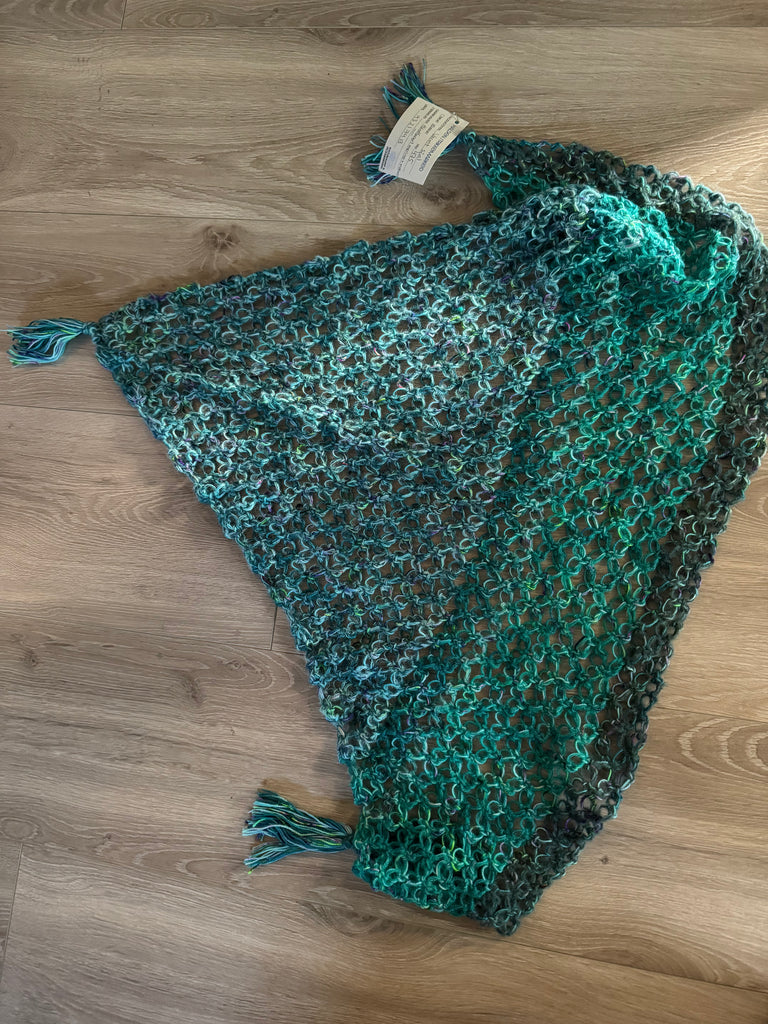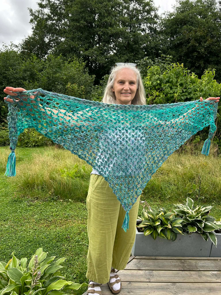 Sjalet er heklet med såkalte kjærlighetsknuter - den perfekte følelsen å svøpe seg inn i i stillhet. I hvert hjørne er det en lang, slank dusk.